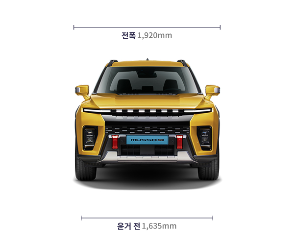 무쏘 EV는 기존 SUV의 장점에 픽업트럭 스타일을 더한 독창적인 디자인과 실용성을 자랑합니다. KGM의 "Handy & Tough" 디자인 철학을 바탕으로 강인하면서도 현대적인 외관을 구현했습니다.