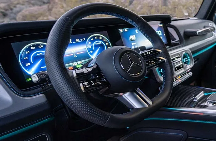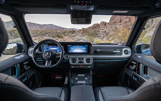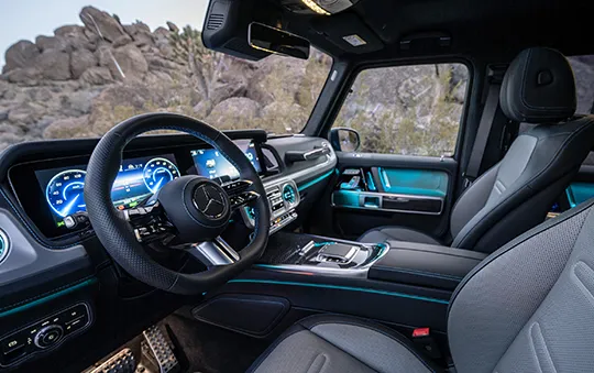 성능 면에서 전기 G바겐은 기존 모델을 뛰어넘는 오프로드 능력을 자랑합니다. 4개의 개별 제어 전기 모터를 탑재하여 총 579마력의 출력과 1,164Nm의 토크를 발휘합니다. 이는 가솔린 모델인 AMG G63보다도 314Nm 더 높은 수치입니다. 전기 모터의 특성상 즉각적인 토크 발생이 가능하기 때문에, 험로 주행 시 더욱 정교한 컨트롤이 가능합니다.