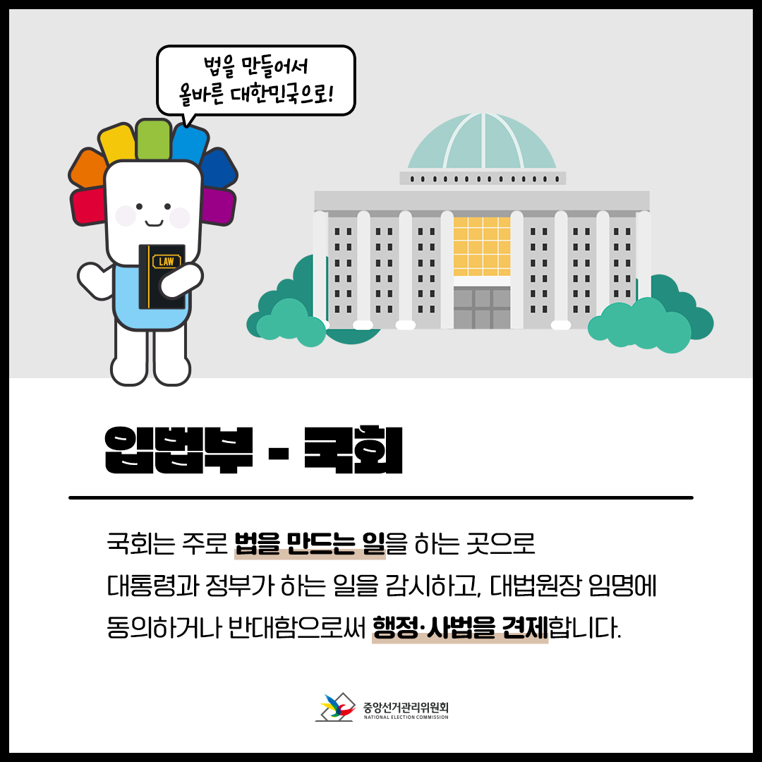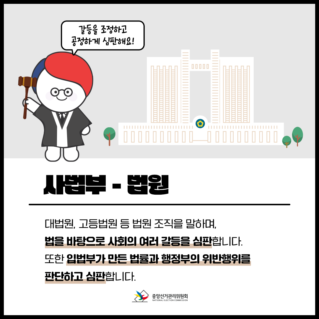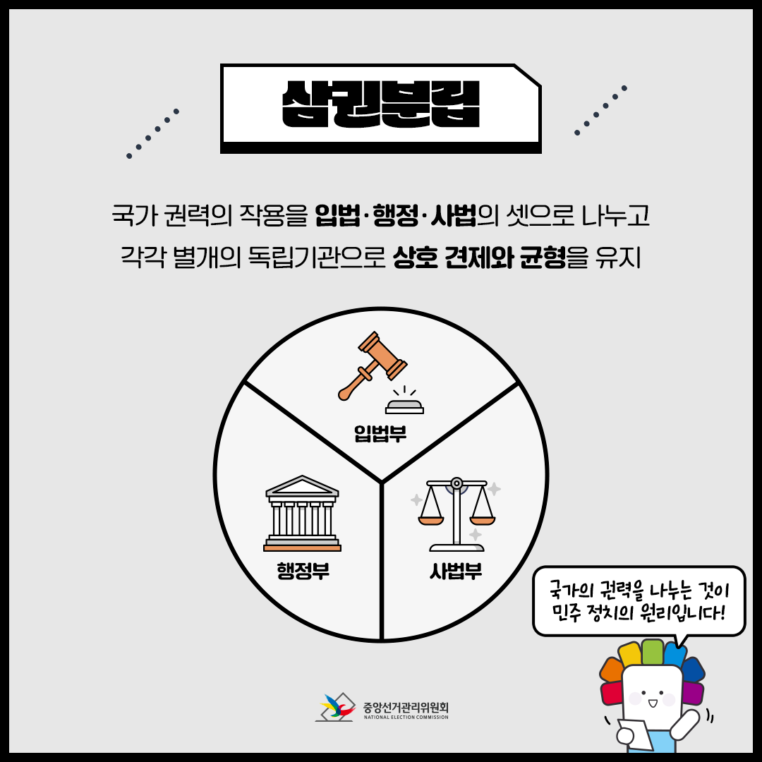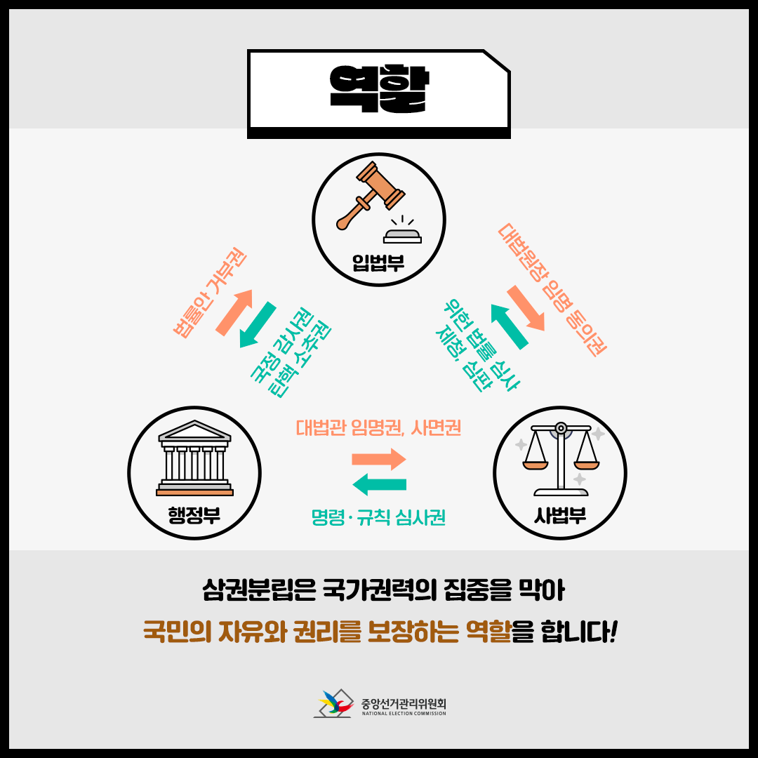 이렇게 세 기관이 각자의 역할을 분담함으로써, 어느 한 기관도 권력을 독점하지 못하게 하고, 서로를 감시하고 견제할 수 있습니다.