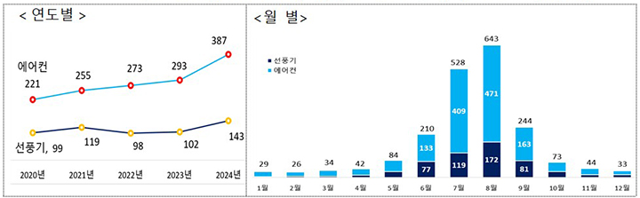 최근 5년(2020~2024년)간 에어컨 화재는 약 1.8배, 선풍기 화재는 약 1.4배로 크게 늘었습니다.