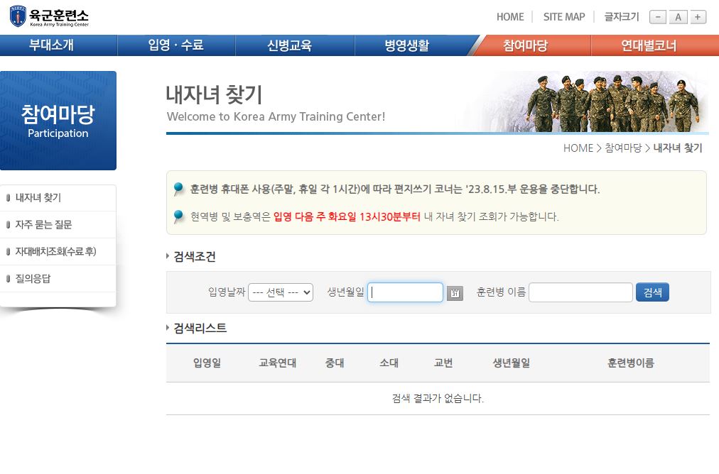 - 입영 후 1주일 이내에는 소속이 확정되지 않아 검색이 불가할 수 있습니다.