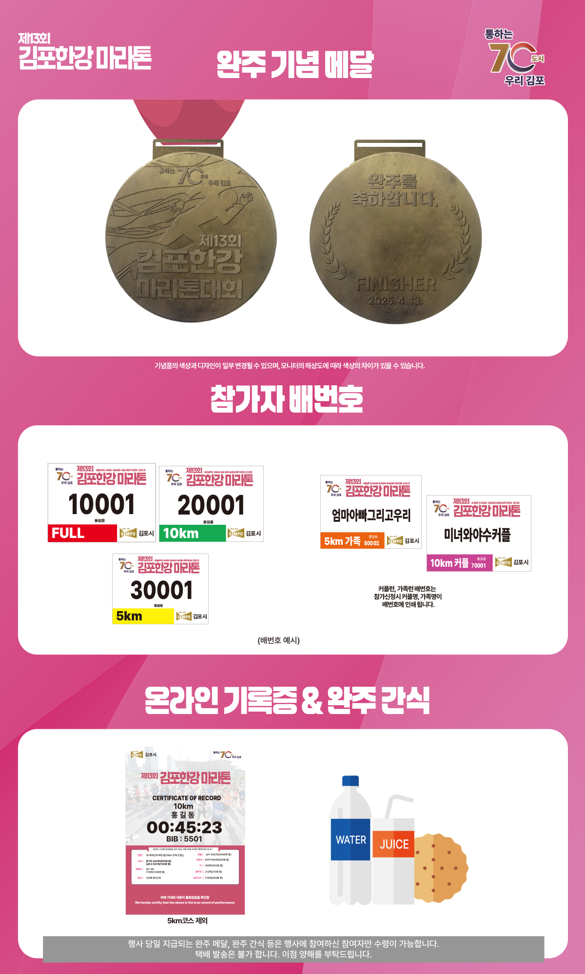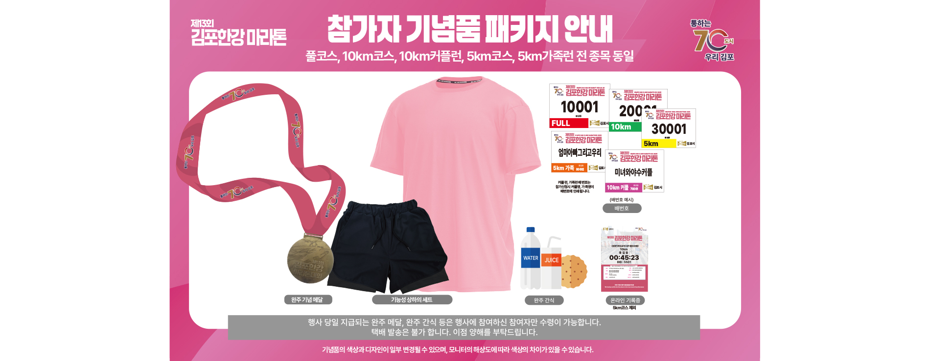- 김포한강 마라톤은 아름다운 한강변을 배경으로 도전과 성취를 경험할 수 있는 특별한 기회를 제공합니다. 본인의 목표와 체력에 맞는 코스를 선택하고 철저히 준비하여 완주의 기쁨을 만끽하세요!