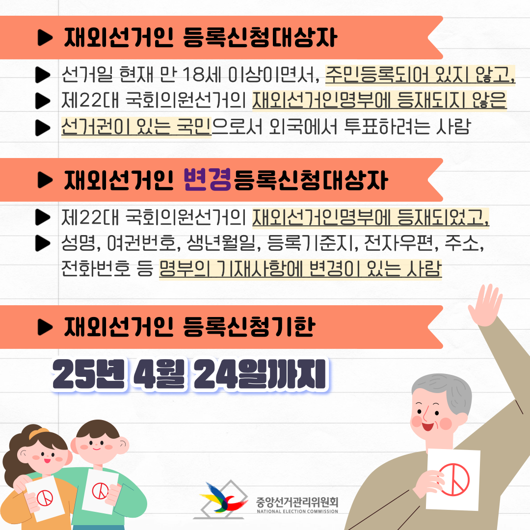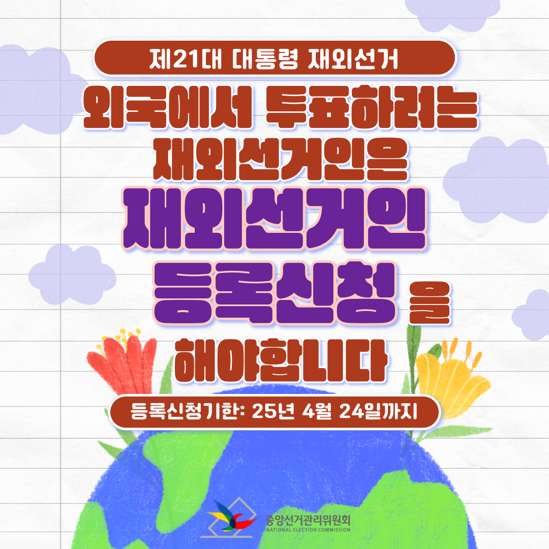 1. 국외부재자 신고 및 재외선거인 등록: 2025년 4월 24일(목)까지