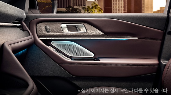 실내 마감 역시 고급스러움을 더했습니다. 플래티넘 트림의 경우 대시보드에 사운드바와 뱅앤올룹슨 스피커가 적용되었으며, 블랙 우드 느낌의 텍스처로 마감되었습니다. 하단 대시보드와 도어 패널 팔걸이에는 가죽이 적용되어 전반적으로 고급스러운 분위기를 연출합니다.