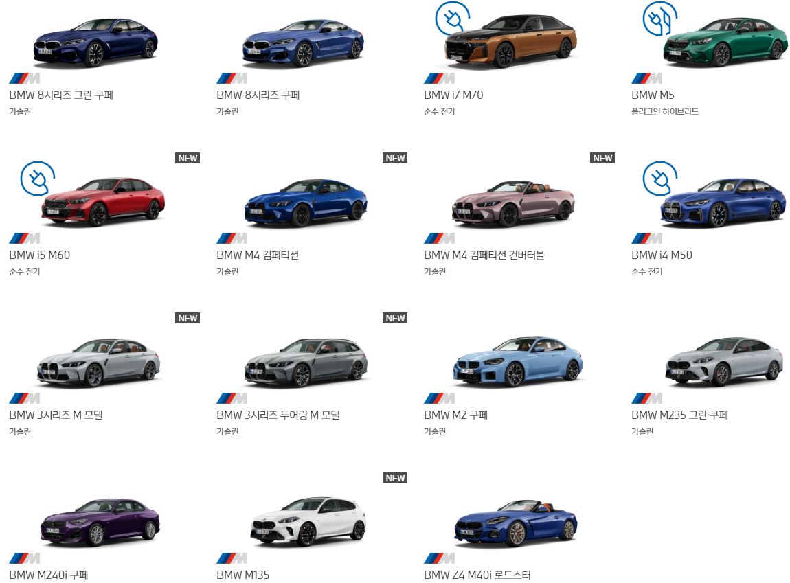 2시리즈: 쿠페와 그란쿠페 모델로 구성되며, 스포티한 주행 성능을 강조합니다. 특히 M2 모델은 고성능 콤팩트 쿠페의 대명사로 자리잡았습니다.