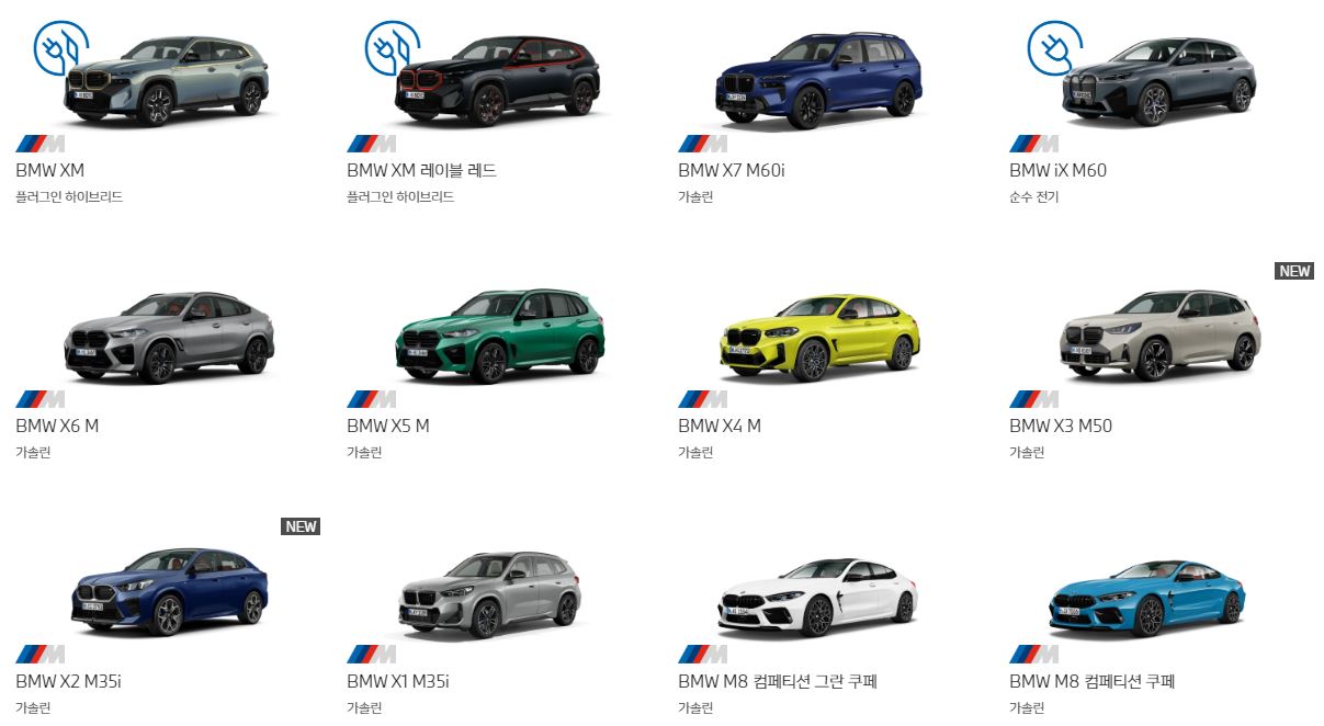M 시리즈: BMW의 고성능 브랜드인 M 시리즈는 일반 모델을 기반으로 극한의 성능을 끌어올린 특별한 라인업입니다. 주요 모델로는 M2, M3, M4, M5, M8 등이 있으며, SUV 모델인 X3 M, X4 M, X5 M, X6 M도 포함됩니다.