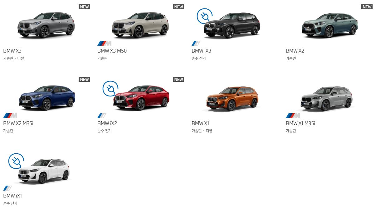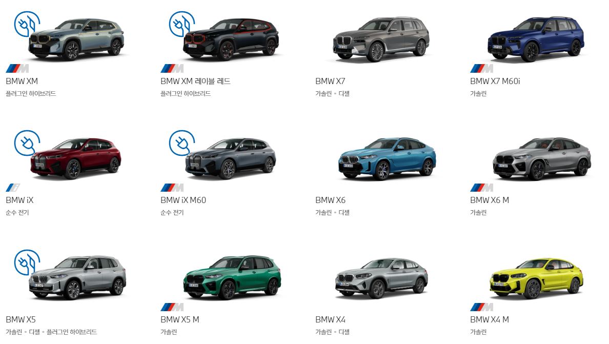 X3: 중형 SUV 시장에서 강세를 보이는 모델로, 실용성과 주행 성능의 균형을 잘 잡았습니다. 가족용 차량으로 인기가 높습니다.