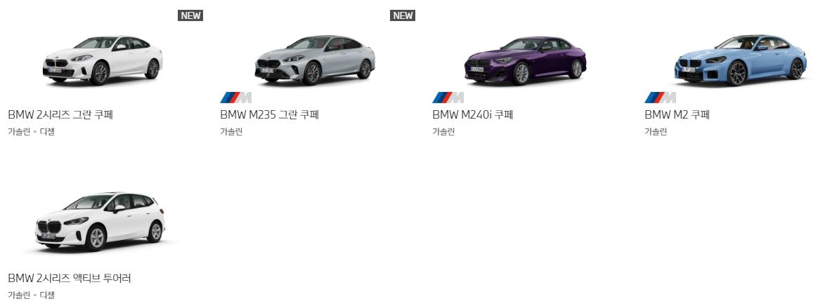 2시리즈: 쿠페와 그란쿠페 모델로 구성되며, 스포티한 주행 성능을 강조합니다. 특히 M2 모델은 고성능 콤팩트 쿠페의 대명사로 자리잡았습니다.