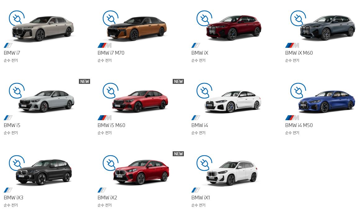 i 시리즈: BMW의 전기차 브랜드인 i 시리즈는 미래 지향적인 디자인과 첨단 전기 파워트레인을 특징으로 합니다. 주요 모델로는 i3, i4, iX3, iX 등이 있습니다.